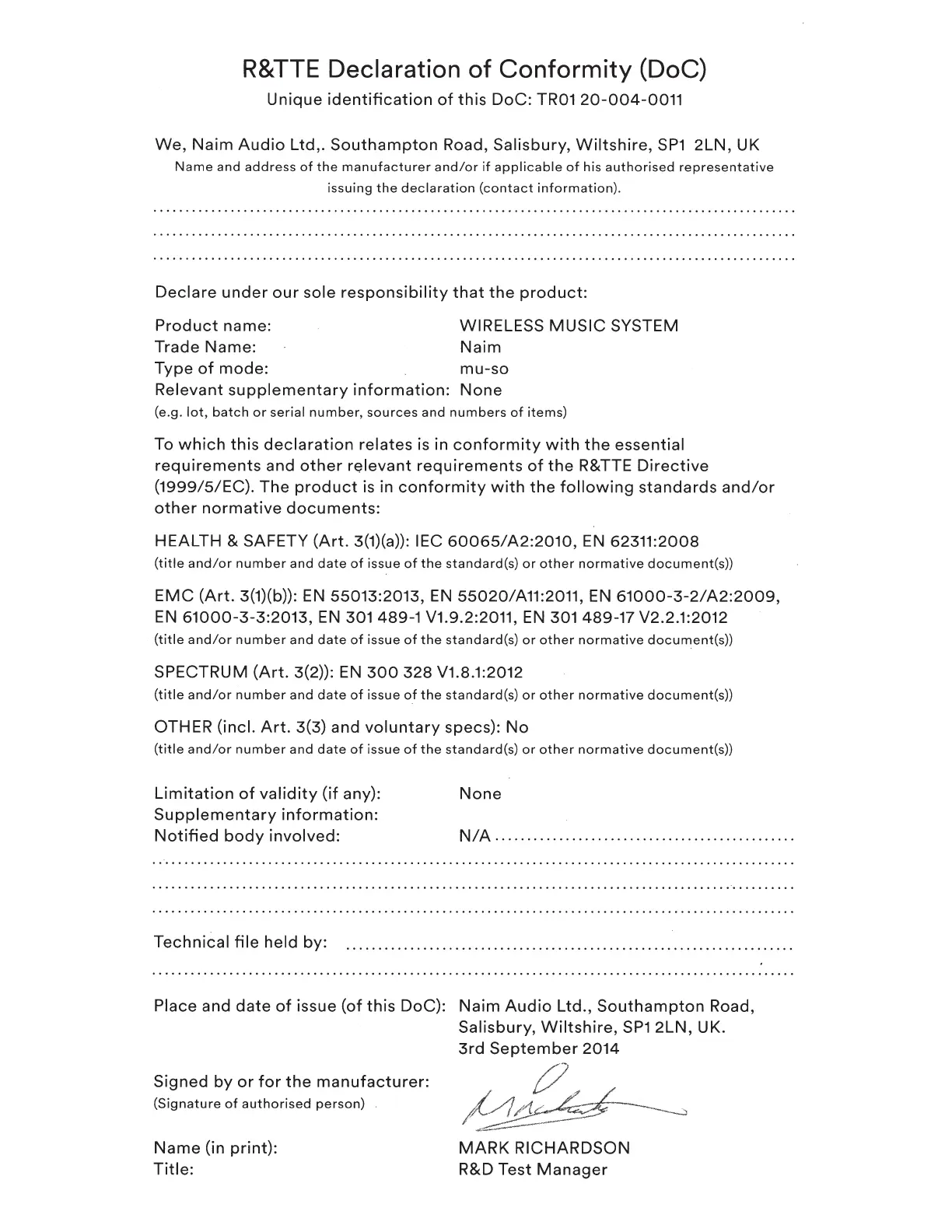 NAIM Mu-so - R&TTE Declaration of Conformity (DoC)