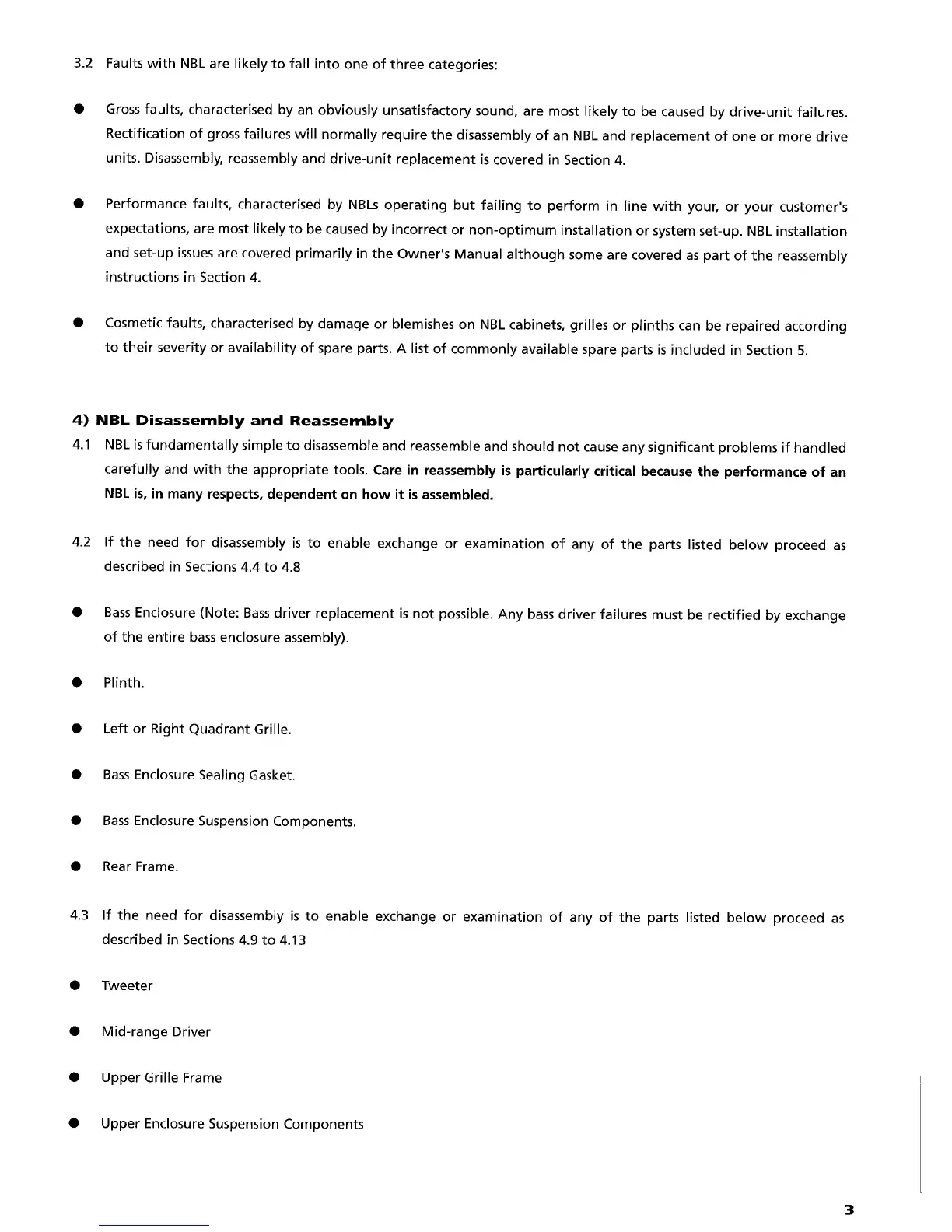 NAIM NBL - Service Issues & Fault Investigation; 3.1 In comparison to many components in a hi-fi system the loudspeaker is fundamentally a simple device. In any case of suspected loudspeaker failure it is important to be certain that the loudspeaker, rather than another component in the system, is actually at fault. A simple procedure of investigation by the substitution of known good items in the hi-fi chain should reveal the true location of any faults. Always be aware however that a faulty power amplifier may damage any loudspeaker subsequently connected to it so be sure of the amplifier before connecting a good loudspeaker.; 3.2 Faults with NBL are likely to fall into one of three categories:; NBL Disassembly and Reassembly