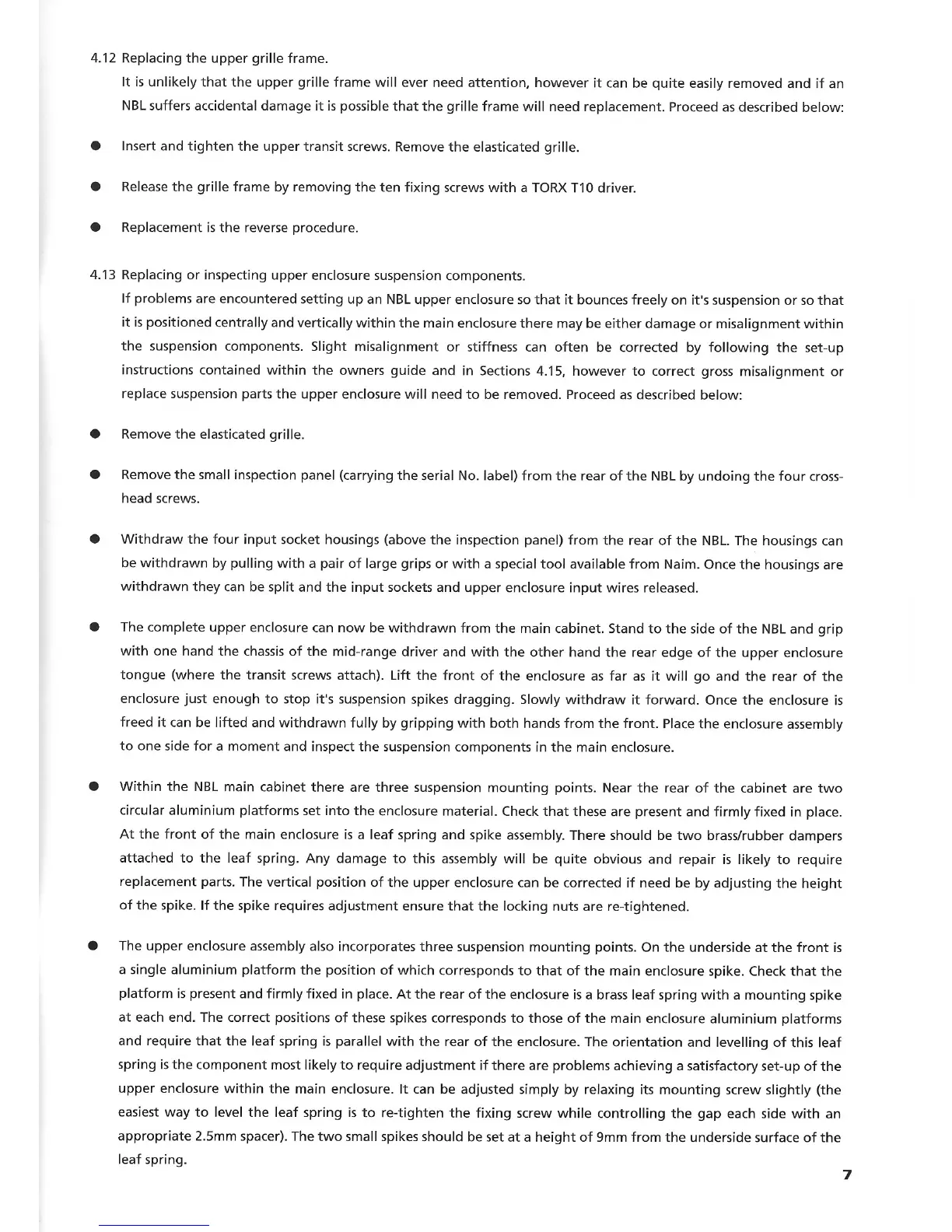 NAIM NBL - 4.12 Replacing the upper grille frame.; 4.13 Replacing or inspecting upper enclosure suspension components.