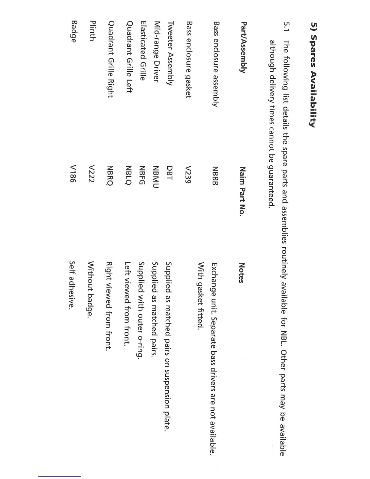 NAIM NBL - Spares Availability; 5.1 The following list details the spare parts and assemblies routinely available for NBL. Other parts may be available although delivery times cannot be guaranteed.