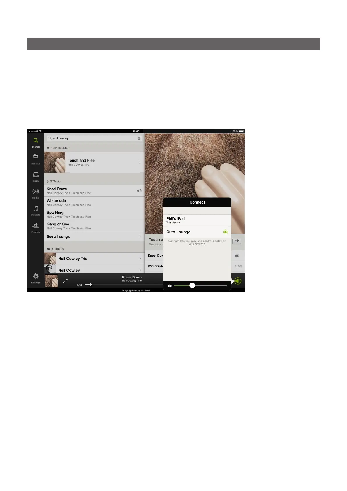启用Spotify输入后,可从Spotify应用程序中选择Streamer。打开Spotify应用程序,并选择“Spotify连