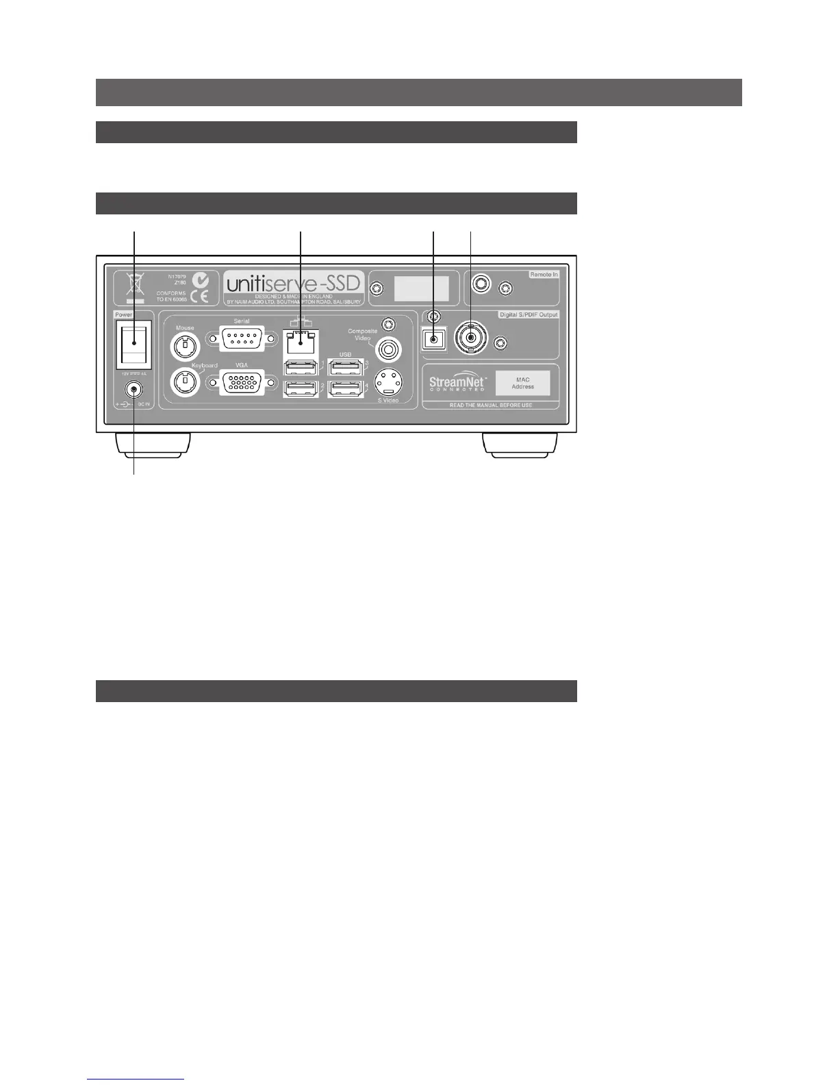 • 找到UnitiServe-SSD后面板的“数字输出”、“网络”和“电源输入”插座。使用标准以太网导线将“
