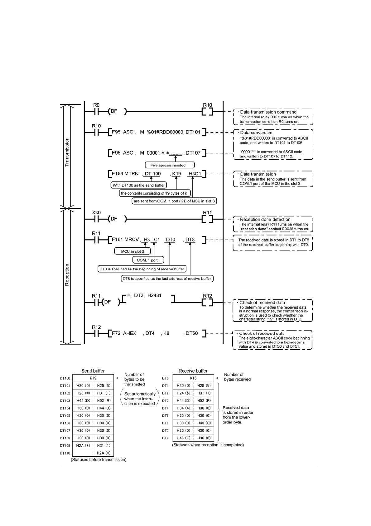 The tables below show the statuses of the send and receive buffers when the sample program is run.