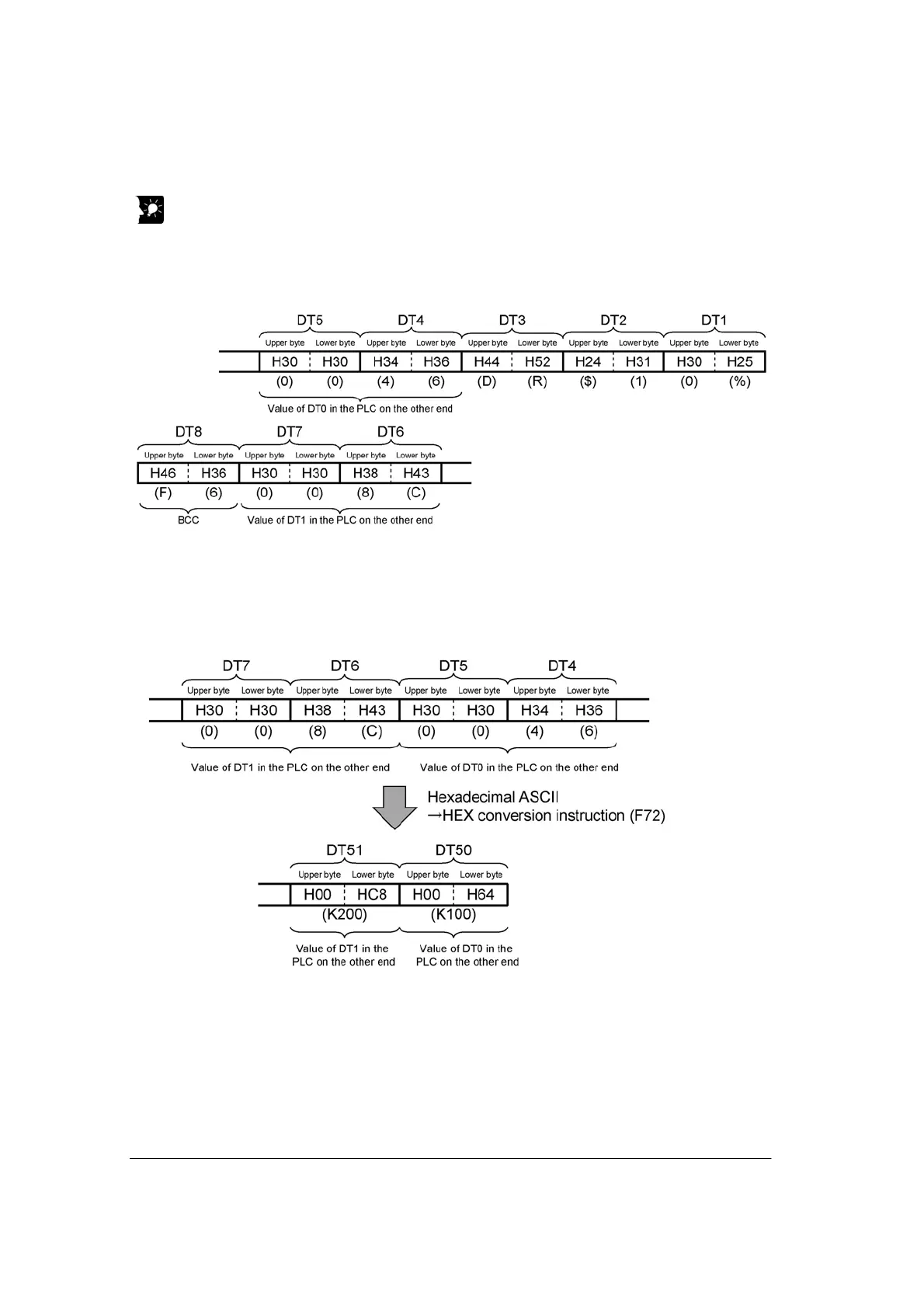 If K100 is stored in DT0 and K200 is stored in DT1 of the FP series PLC on the other end,