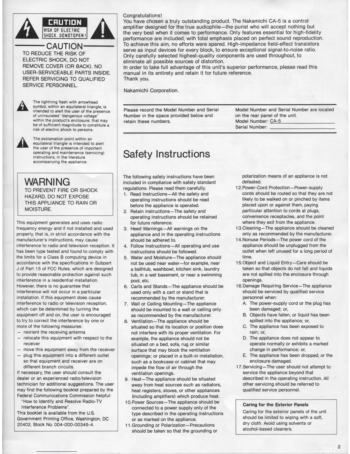 Nakamichi CA-5 - Safety and Precautions; Electrical Safety Warnings; General Operating Safety; Exterior Care Instructions