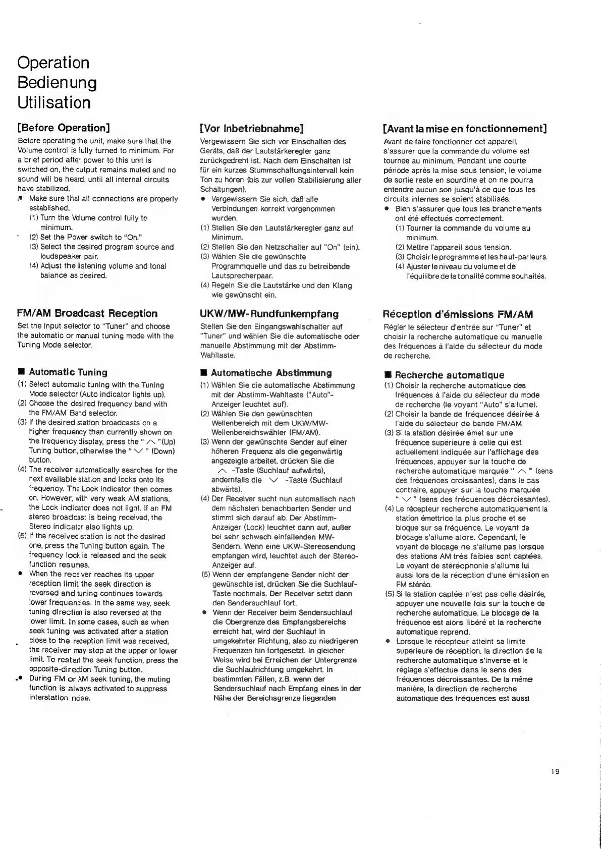 Nakamichi SR-4E - Operation; Before Operation; FM;AM Broadcast Reception; Automatic Tuning