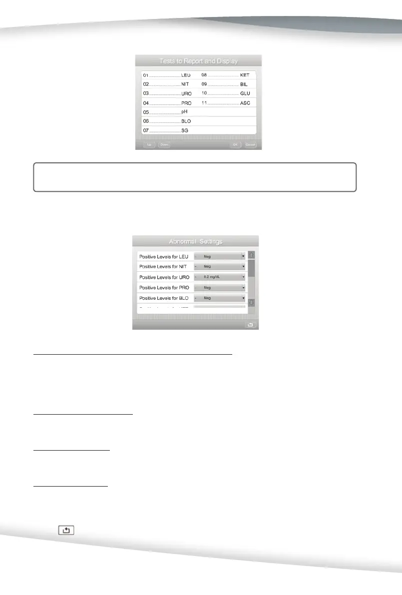URO, PRO, BLO, KET, BIL, GLU, ASC, COL, CLA and Normal Levels for pH, SG, CRE, ALB, CA.