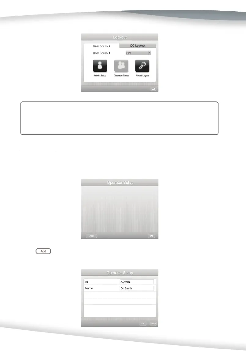 Press Operator Setup to add, delete, edit, or select operator acounts. A total of 800 opera-
