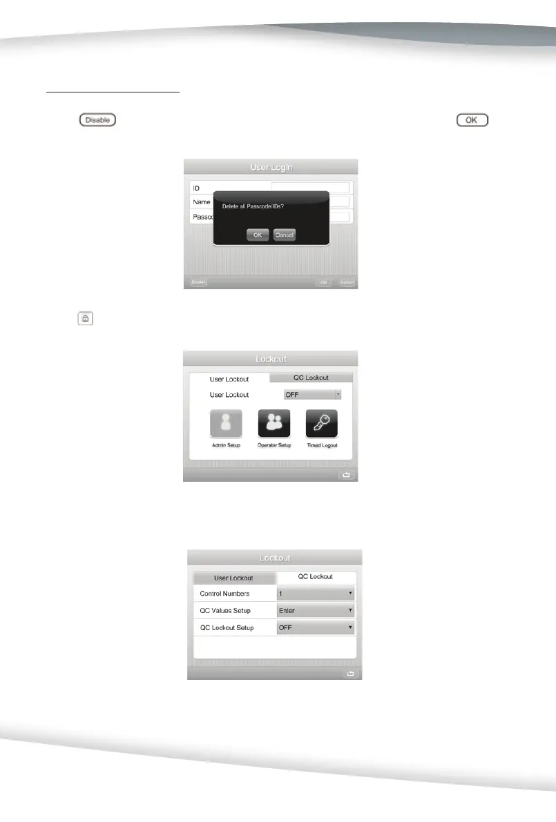 Press to display the Lockout screen to confi gure the User Lockout and QC Lockout op ons.