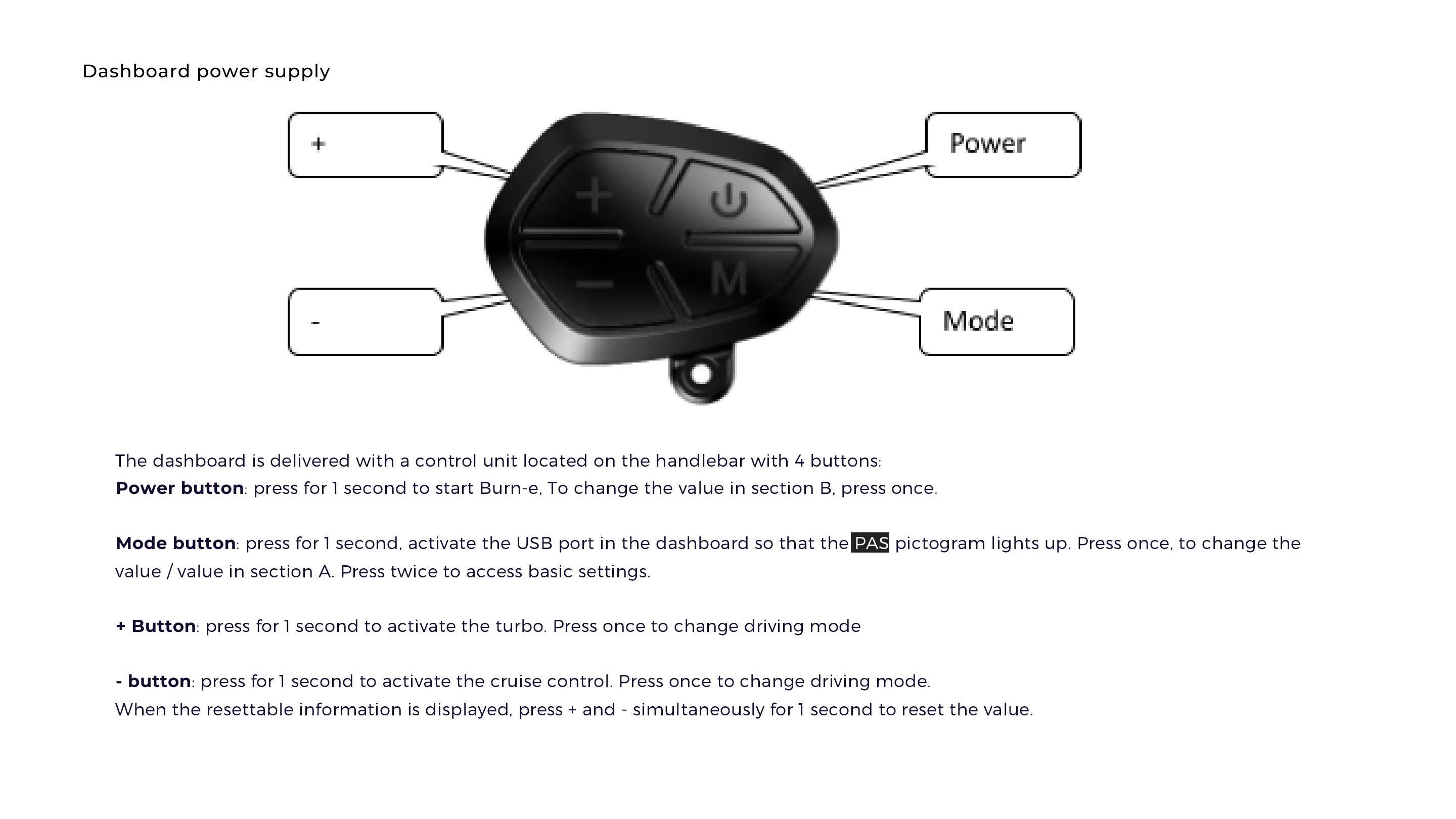 NAMI ELECTRIC BURN-E - Dashboard Controls and Power Supply; Dashboard Button Functions