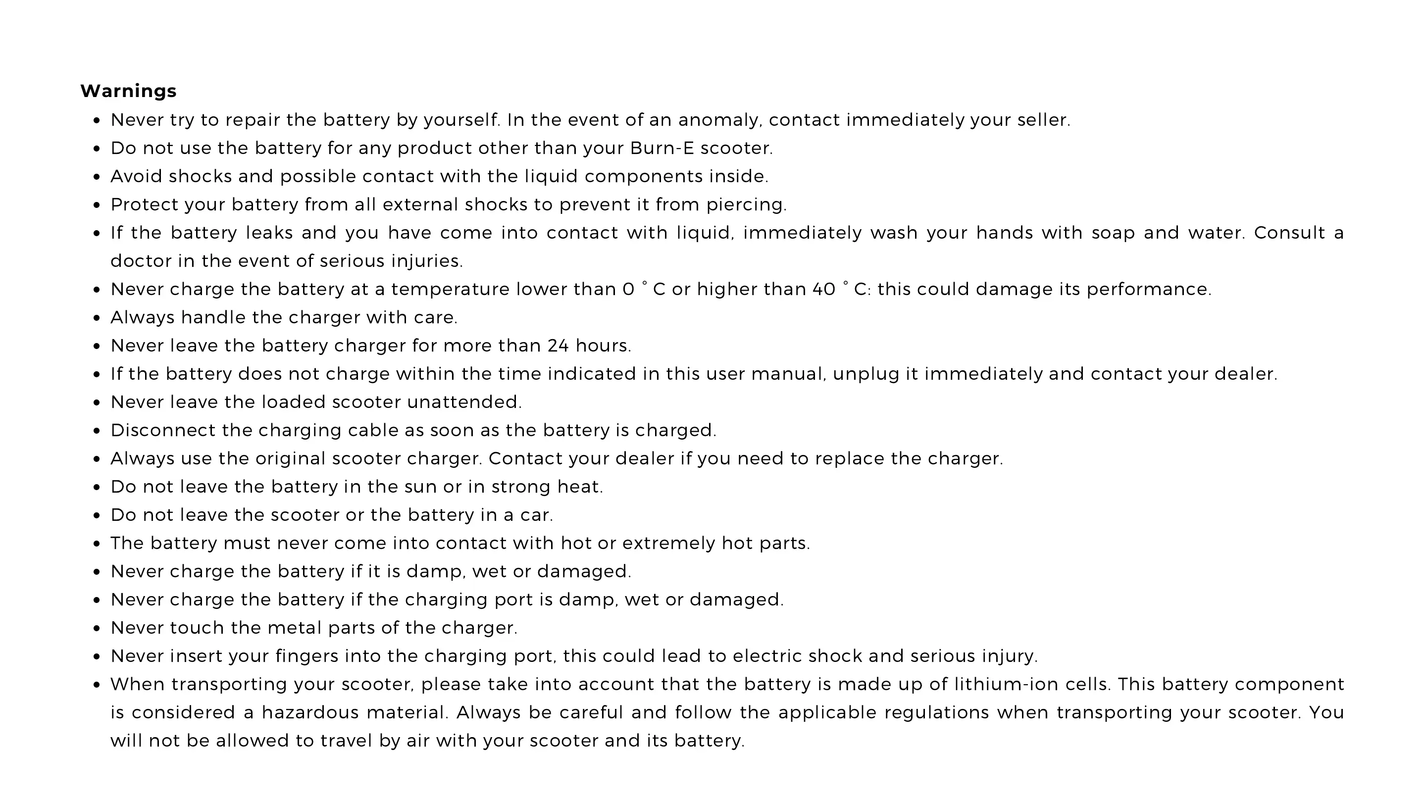 NAMI ELECTRIC BURN-E - Battery and Charger Safety Warnings