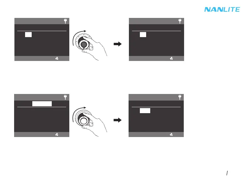 Rotate the right knob to select DIM, CCT, INTENSITY (range: 1-100) or SPEED (range: 1-100),
