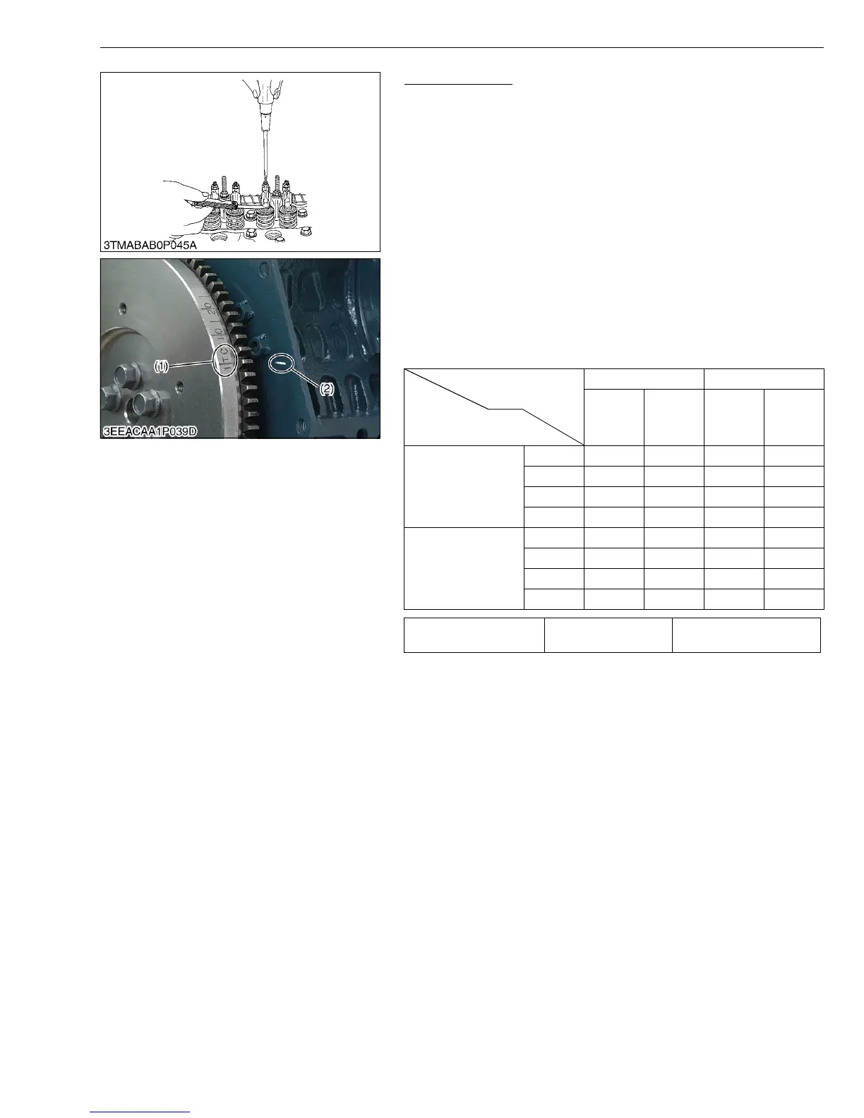 2. Align the “1TC” mark (1) on the flywheel and alignment mark (2)