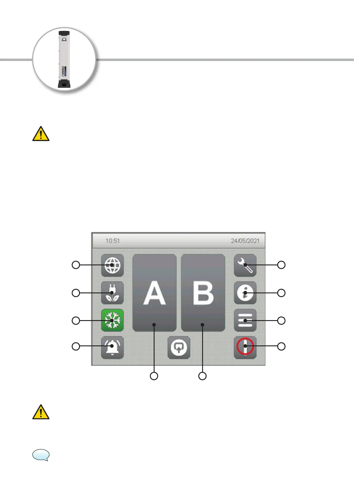 After 10 minutes of inactivity, the HMI will enter an energy saving mode where the HMI screen will go black. A green LED will