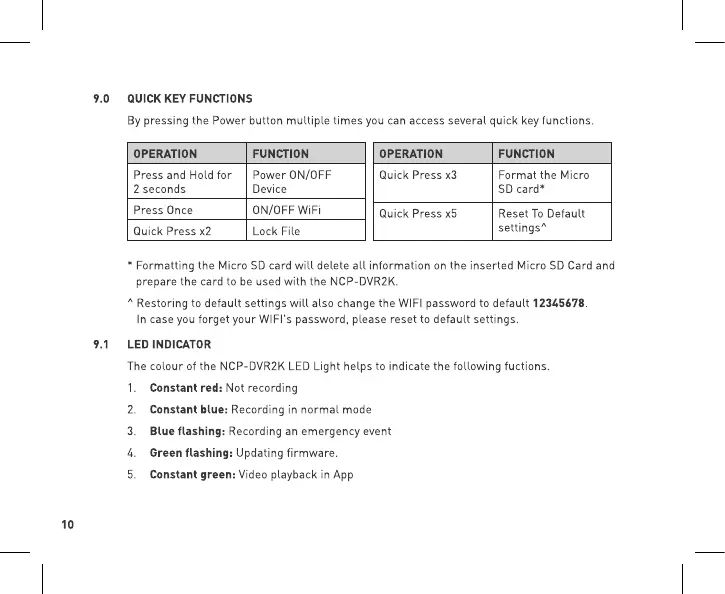 NanoCam Plus NCP-DVR2K - Quick Key Functions; LED Indicator