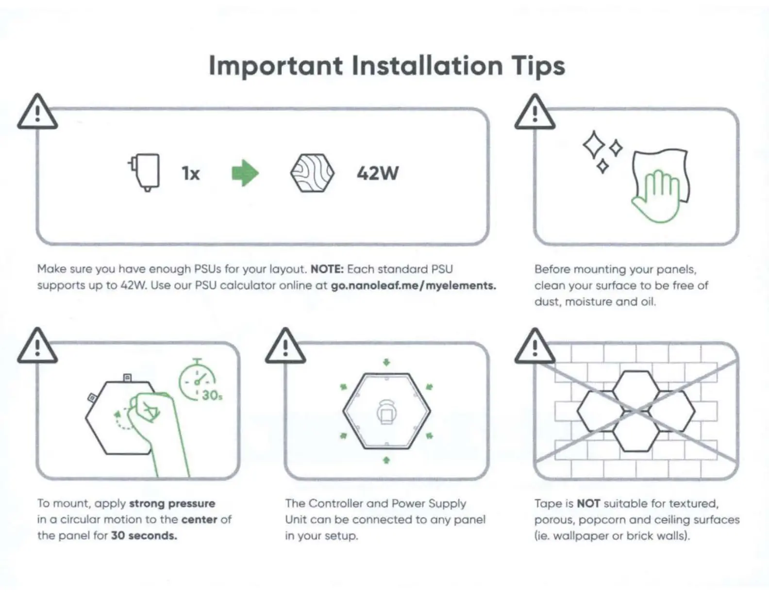 Nanoleaf Elements - Important Installation Tips; PSU Capacity and Layout Planning; Surface Preparation for Mounting; Panel Mounting Technique