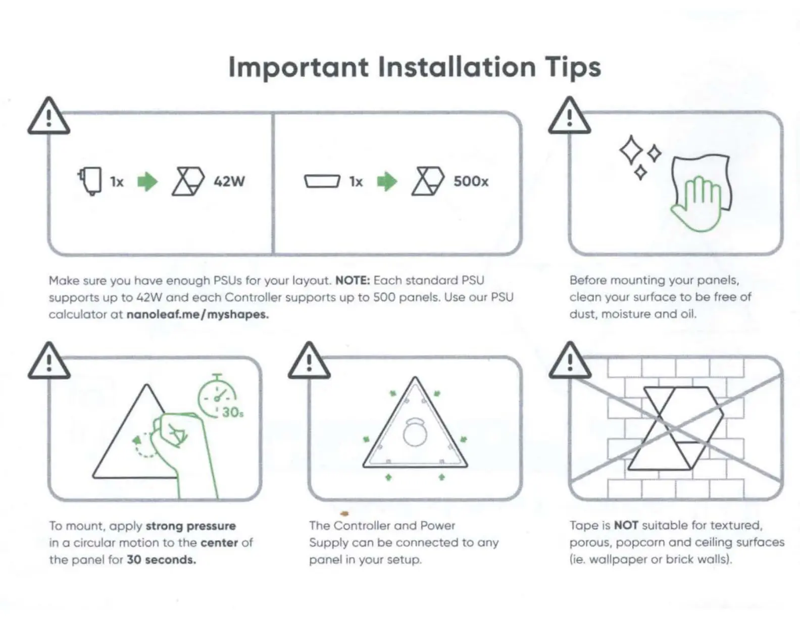Nanoleaf Shapes Triangles / Smarter Kit - Important Installation Tips; PSU Capacity and Layout Planning; Surface Preparation for Mounting; Panel Mounting Pressure