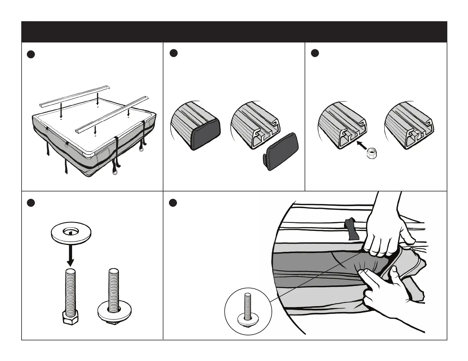 A) Remove plastic end caps. Leave off until step 11. B) Slide the 10mm nylon locking nuts into the