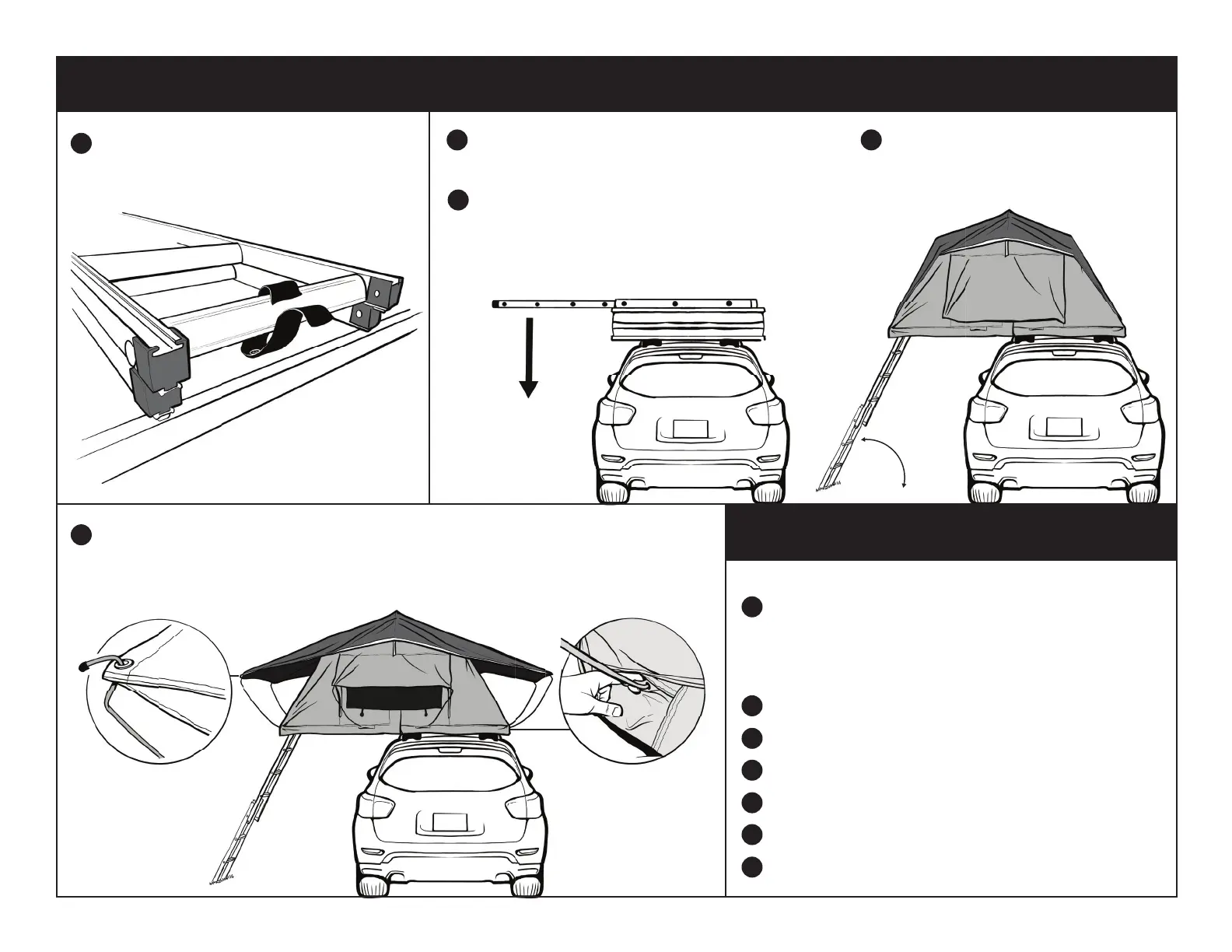 Push ladder up to close tent. Retract ladder and secure Velcro strap.