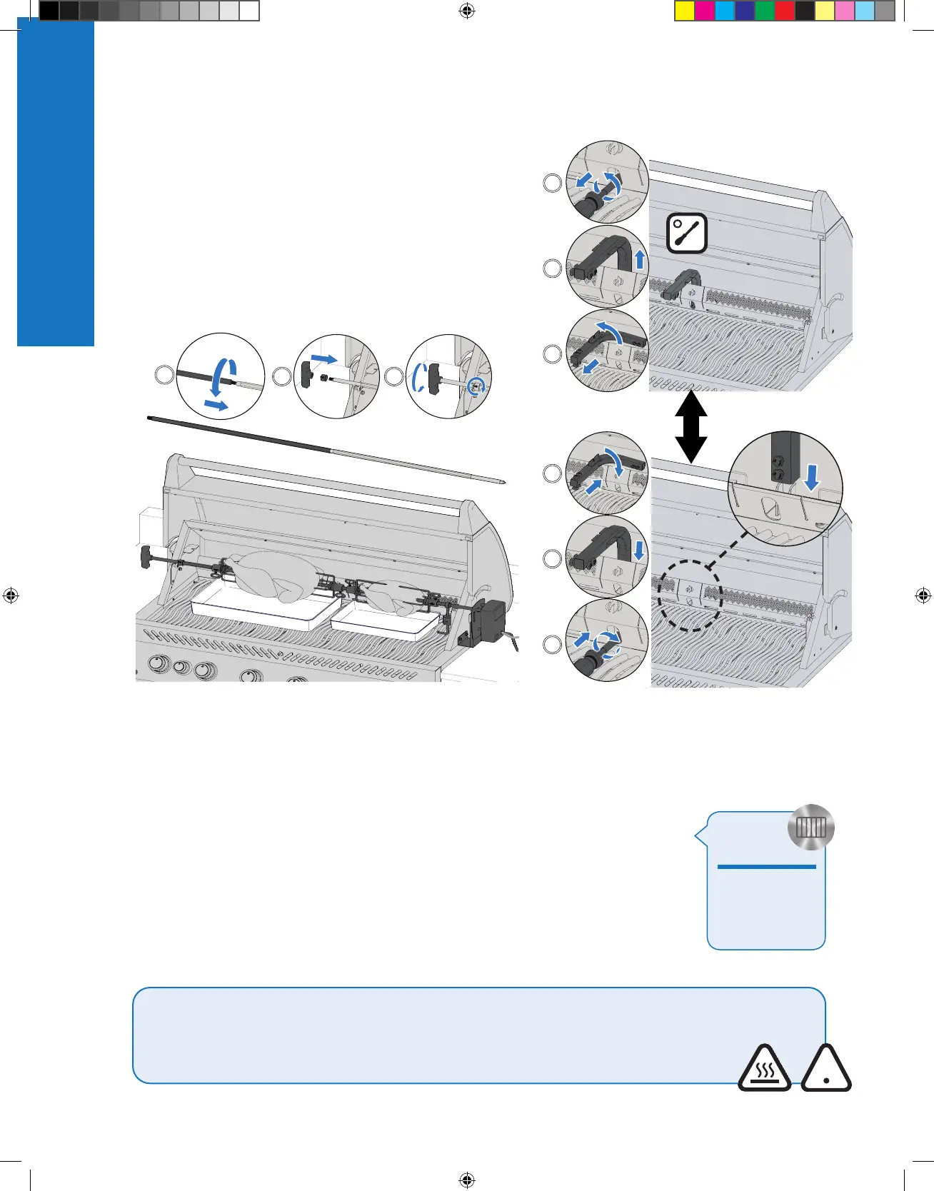 WARNING! Use heat resistant grilling gloves when handling the hot rotisserie components.