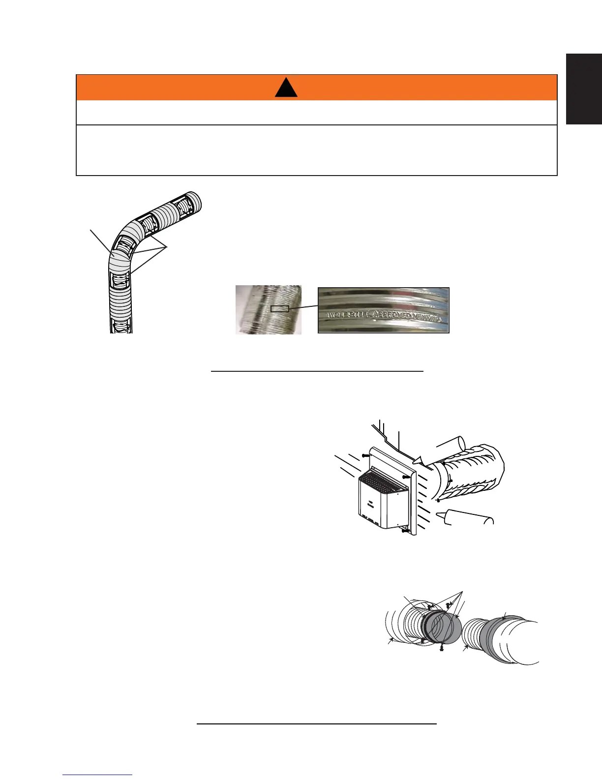 DO NOT ALLOW THE INNER FLEX PIPE TO BUNCH UP ON HORIZONTAL OR VERTICAL RUNS AND ELBOWS.