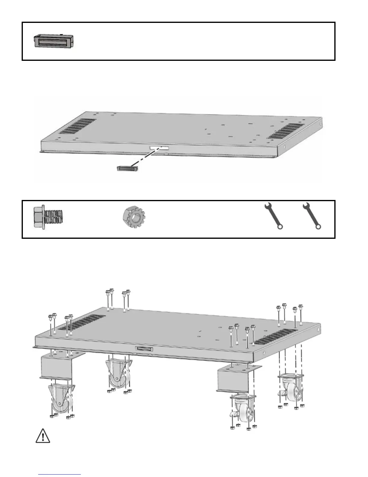 Aach (4) casters, using (4) ¼ -20 x 3/8” screws and (4) ¼ -20 lock nuts for each caster. Aach brackets under front casters