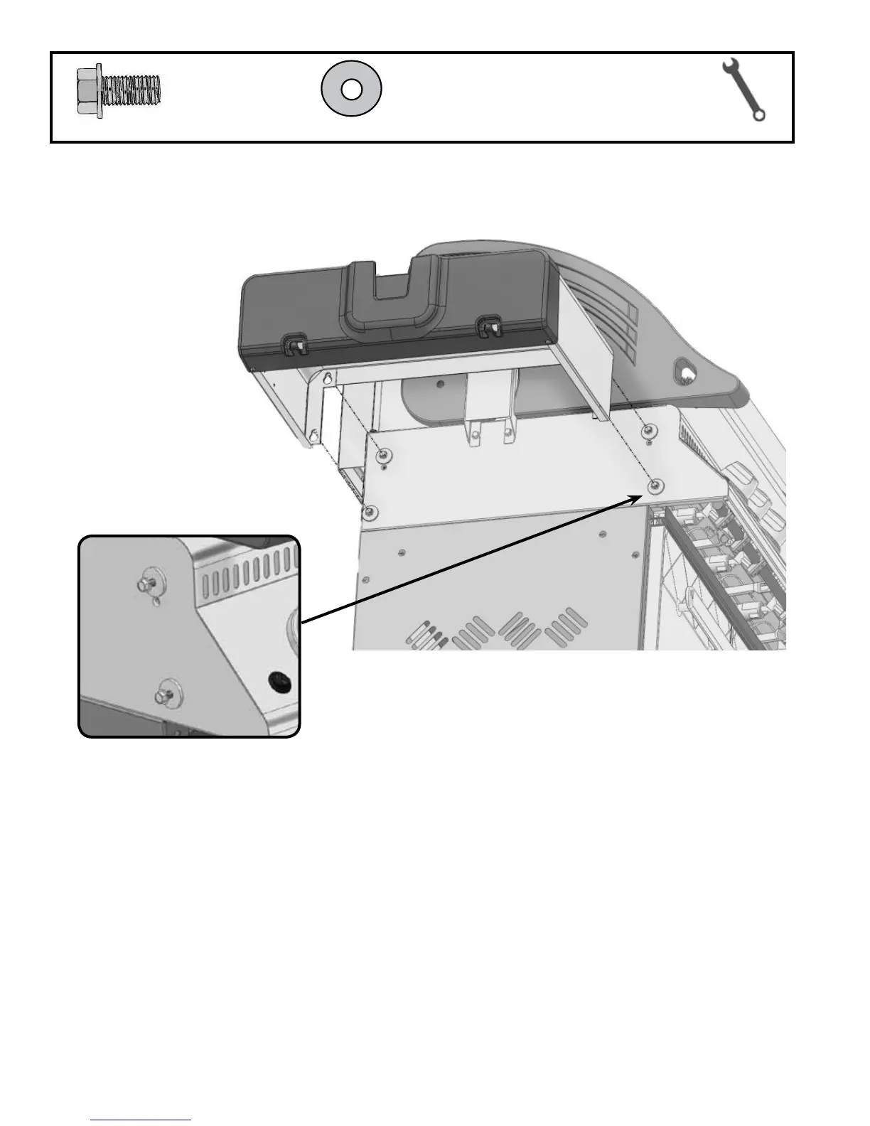 Insert (4) 1/4 - 20 x 5/8” screws through the washers into the threaded holes in the side of the base; do not ghten all the