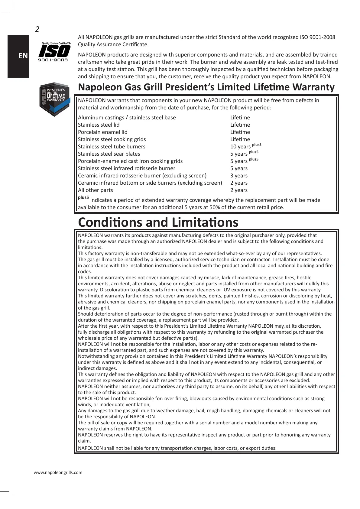 All NAPOLEON gas grills are manufactured under the strict Standard of the world recognized ISO 9001-2008