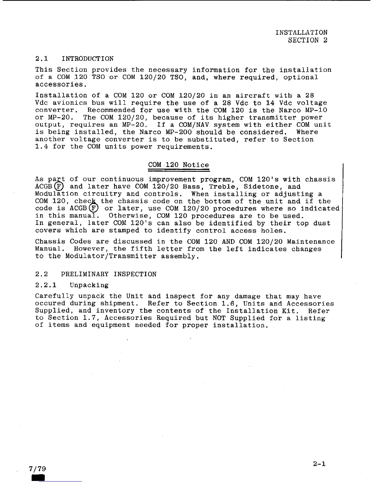 Narco Avionics COM 120 TSO - Preliminary Inspection; Unpacking