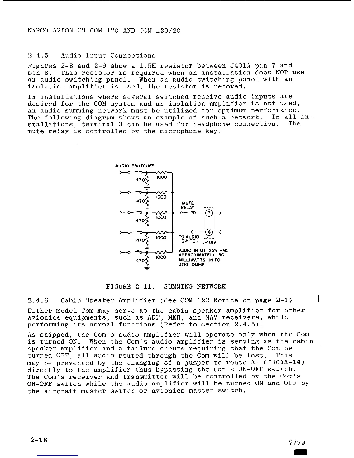 Narco Avionics COM 120 TSO - Audio Input Connections; Cabin Speaker Amplifier; Summing Network