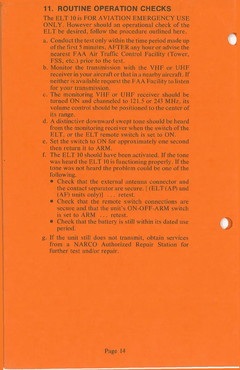 Narco Avionics ELT 10 - ROUTINE OPERATION CHECKS; Troubleshooting Operation Checks