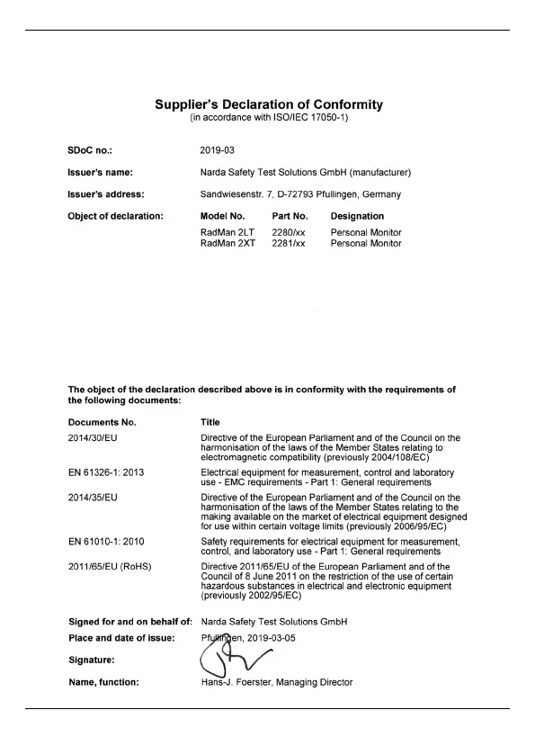 NARDA RadMan 2LT - Declaration of Conformity