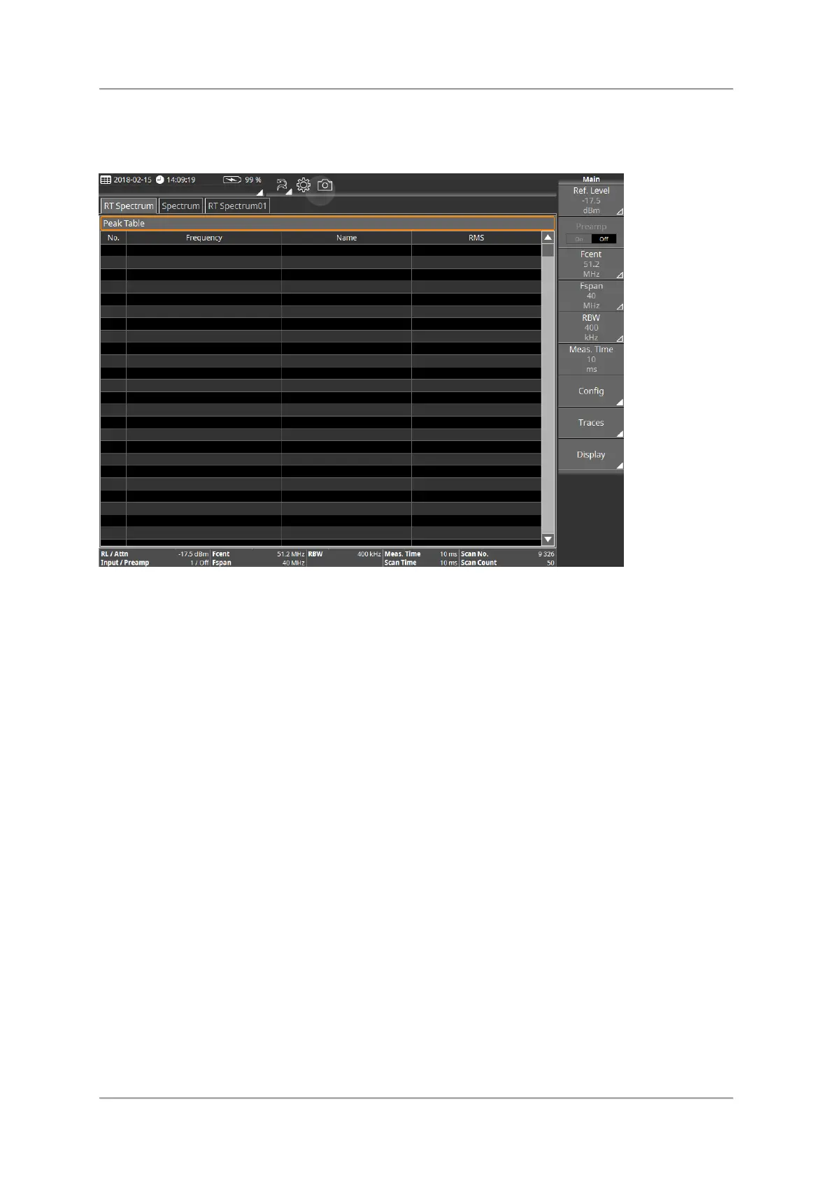 NARDA SignalShark - Peak Table View; Available Buttons