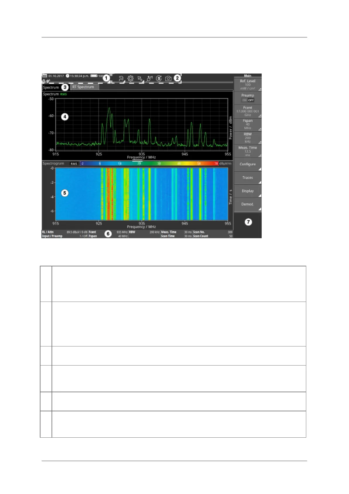 Basic measurement screen with night color scheme and two views (RT Spectrum,
