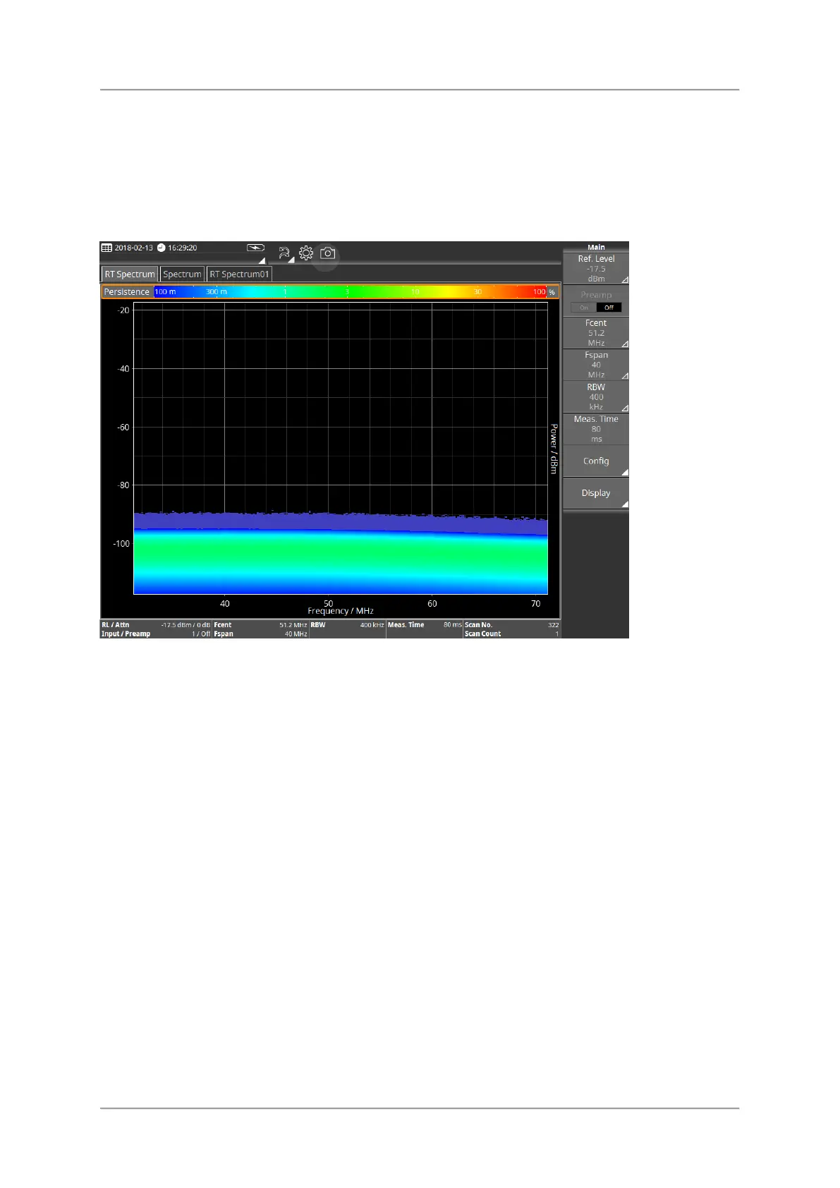 The Persistence View displays the signal level over time using a color spectrum. The colors
