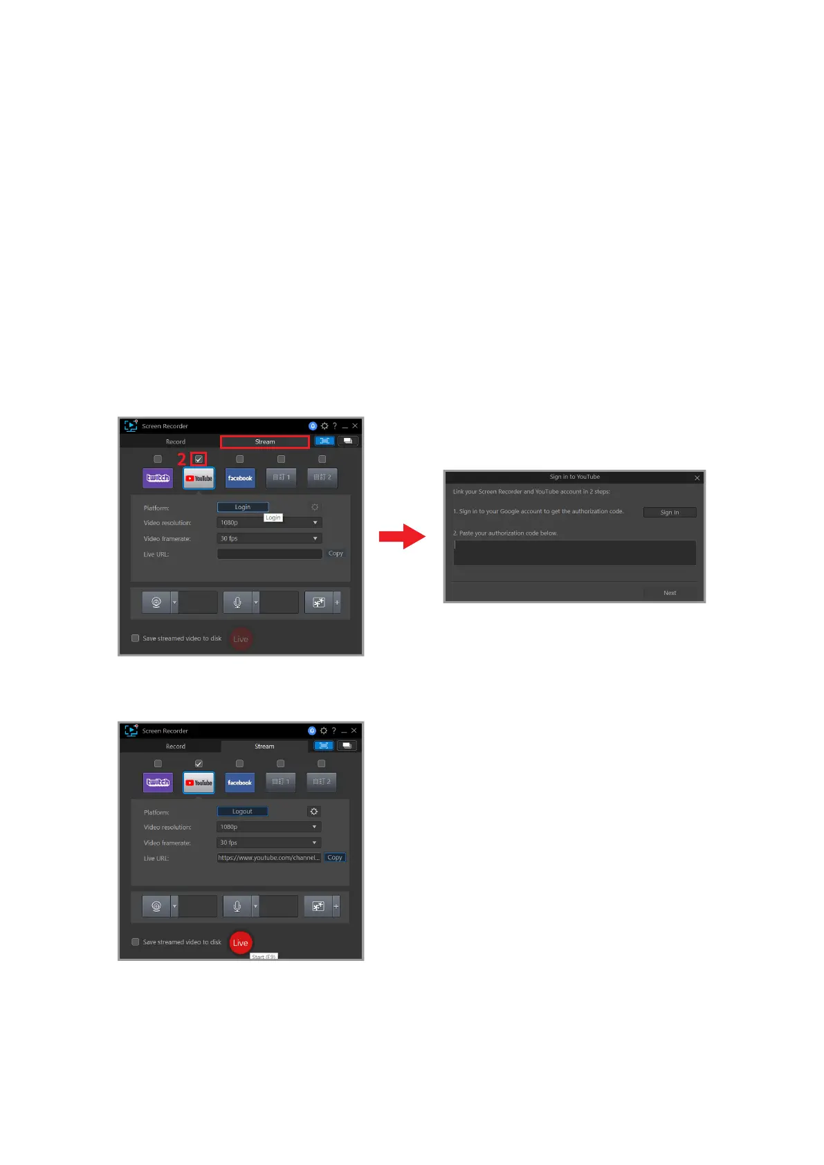Youtube, Facebook. After selecting, follow the instructions below to begin going live.