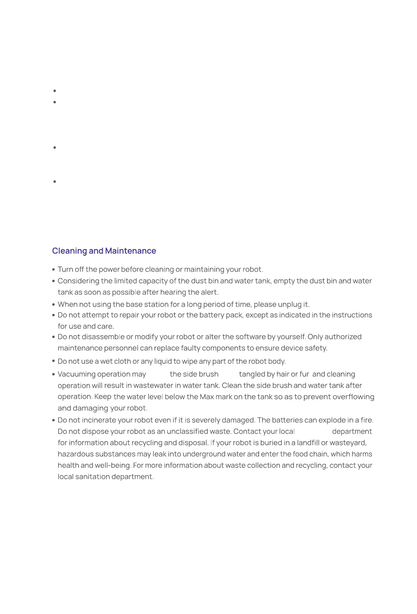 robot away from fire or places with temperatures higher than 130°C/266°F. Otherwise, your