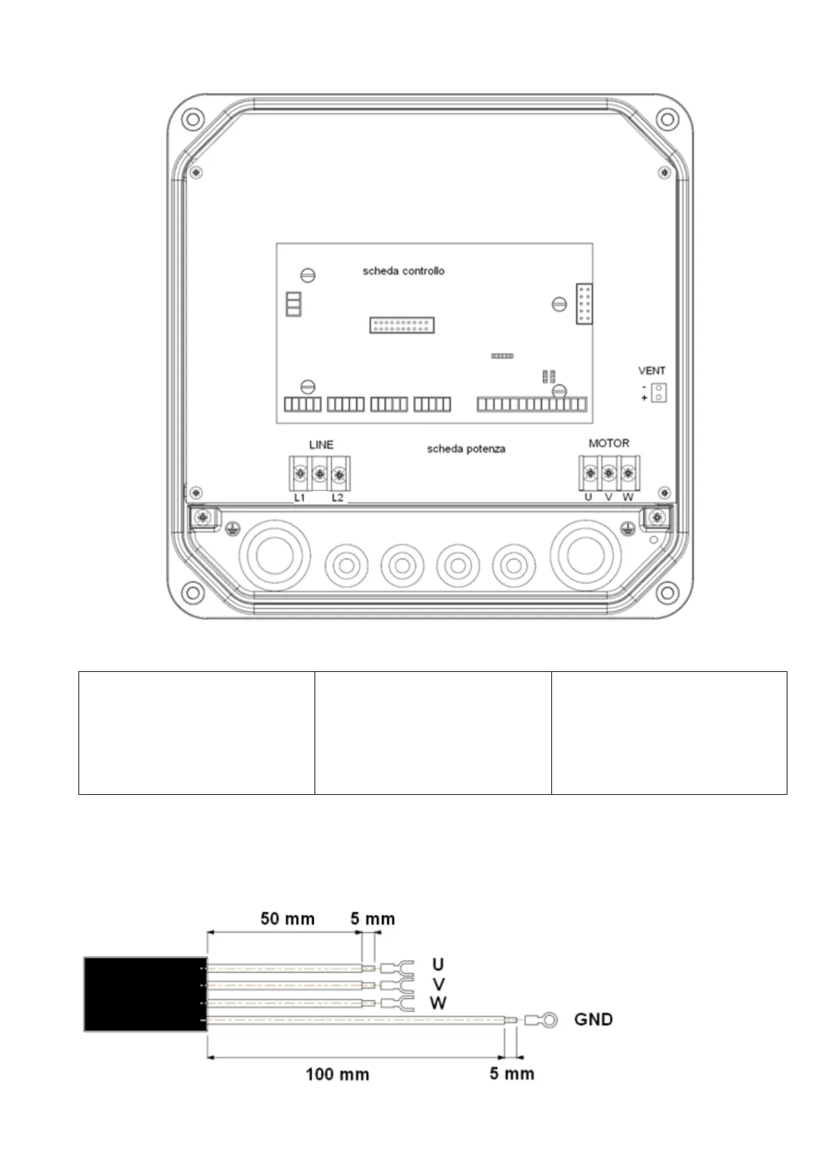 Cable stripping recommended for line input and output to the motor.