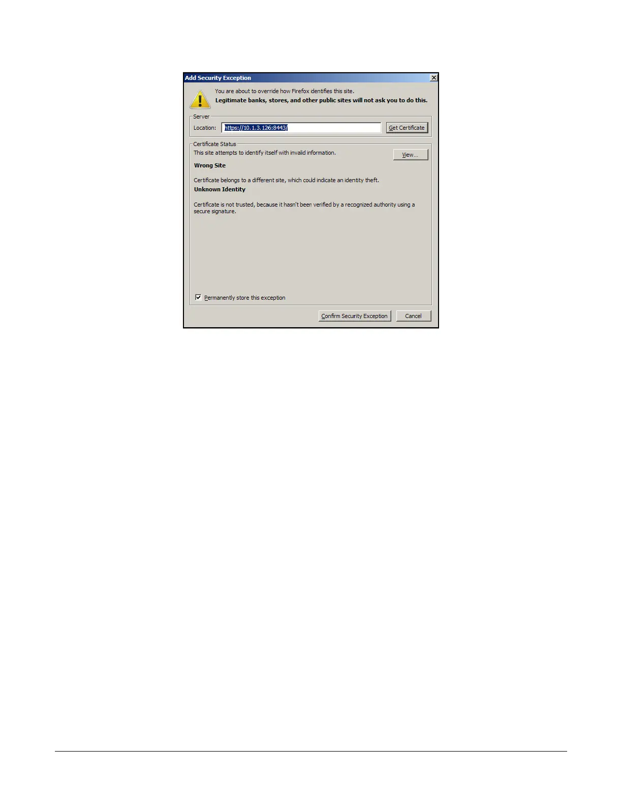 Figure 1-3: Add Security Exception dialog box.