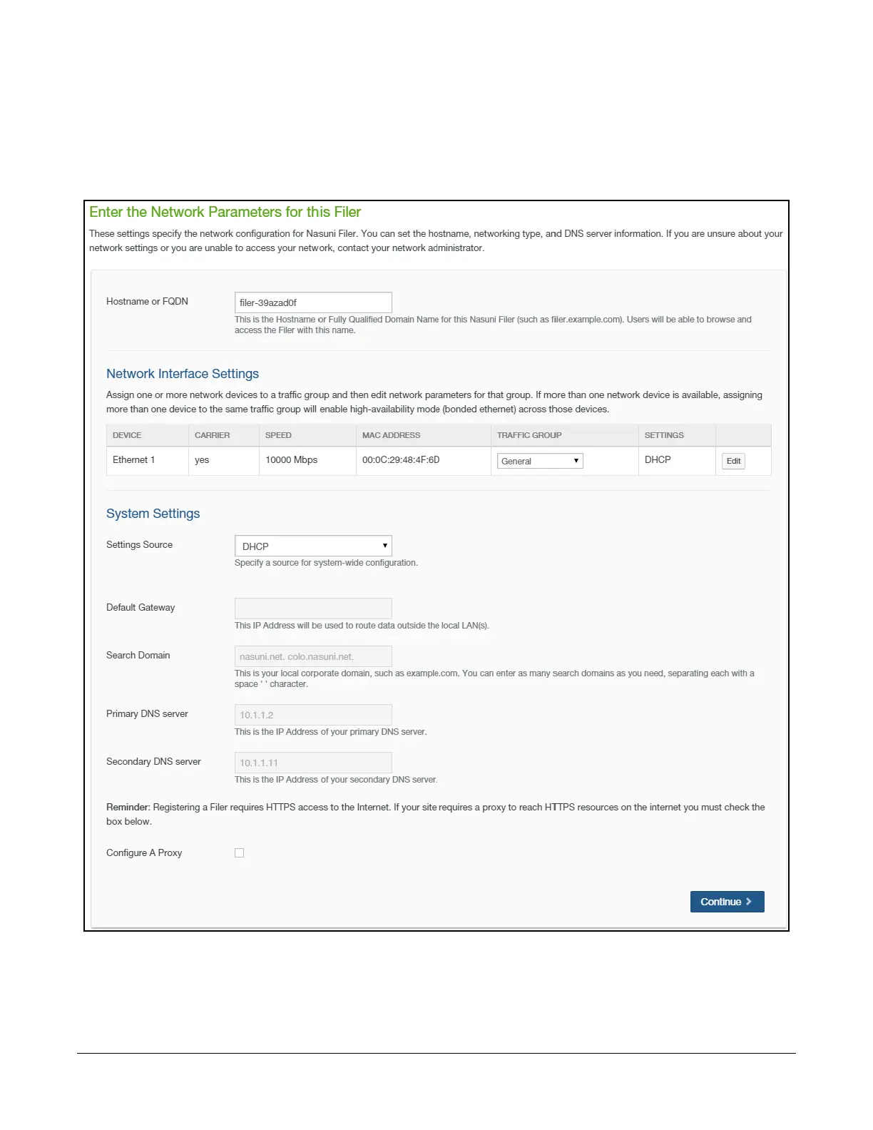 Figure 1-11: “Enter the Network Parameters for this Filer” page.