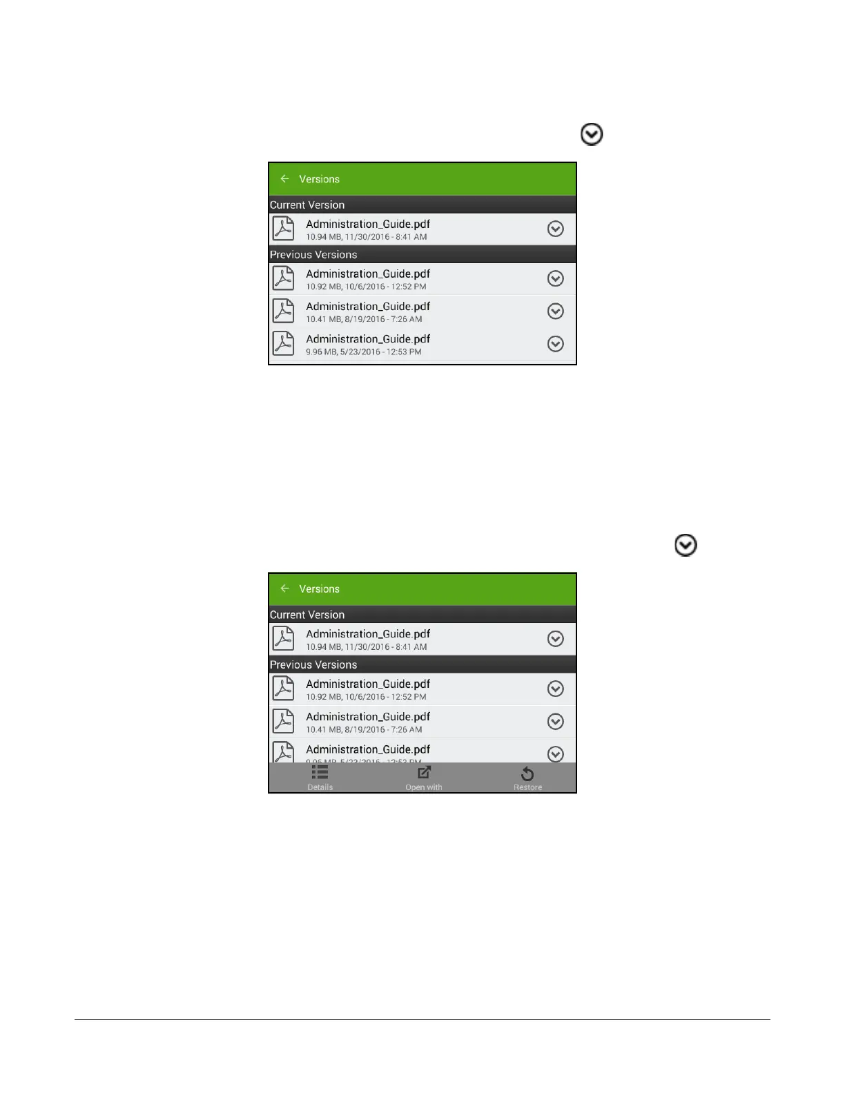 To view any available previous versions of the file, tap the drop-down icon beside its name, then