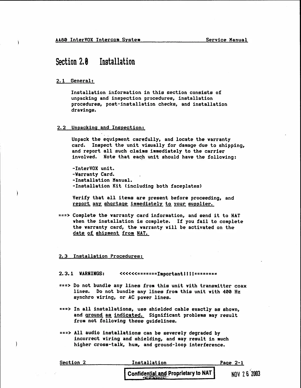Nat AA80 InterVOX - Installation; 2.1 General; 2.2 Unpacking and Inspection; 2.3 Installation Procedures