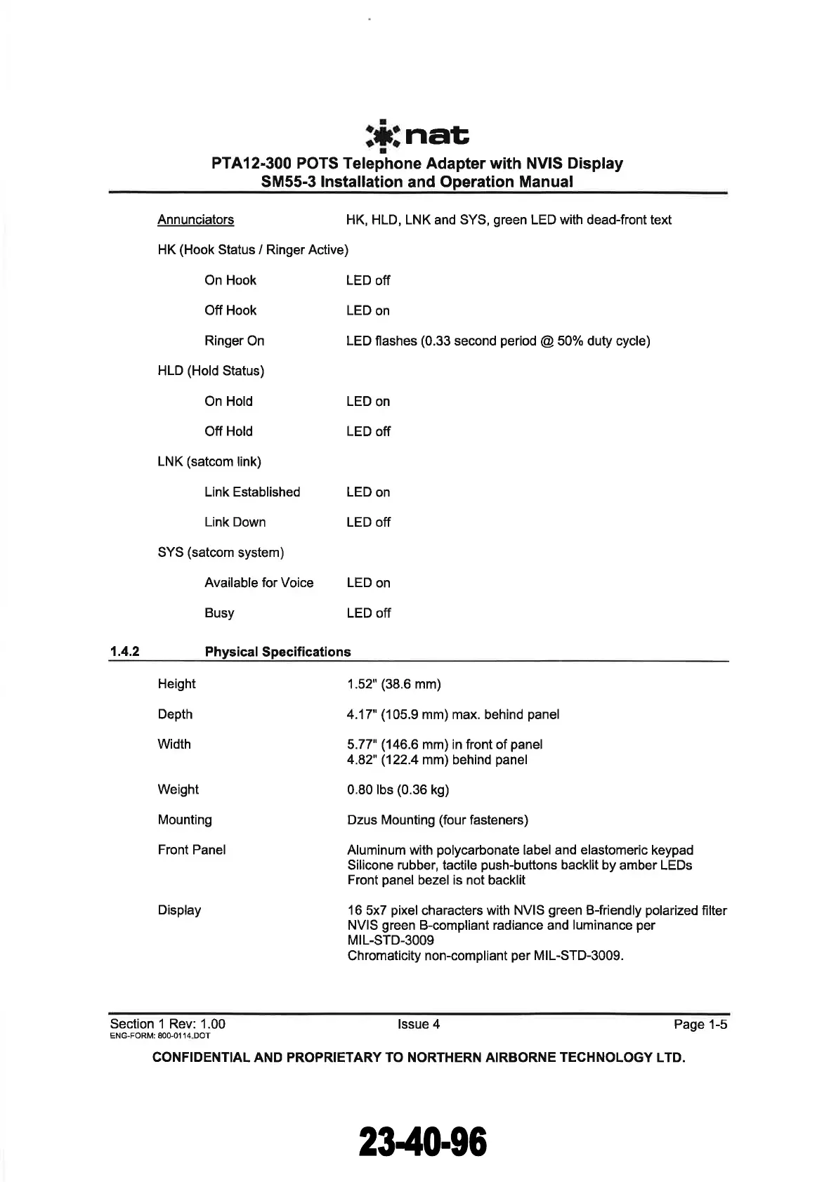 Nat PTA12-300 - Physical Specifications