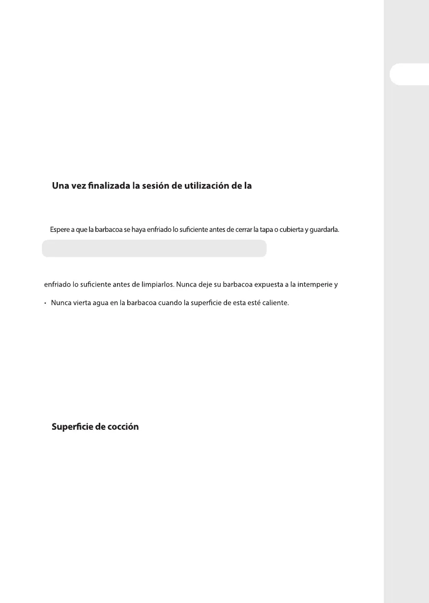• Después de que se haya enfriado la barbacoa, límpiela con agua caliente y jabón. Para eliminar los