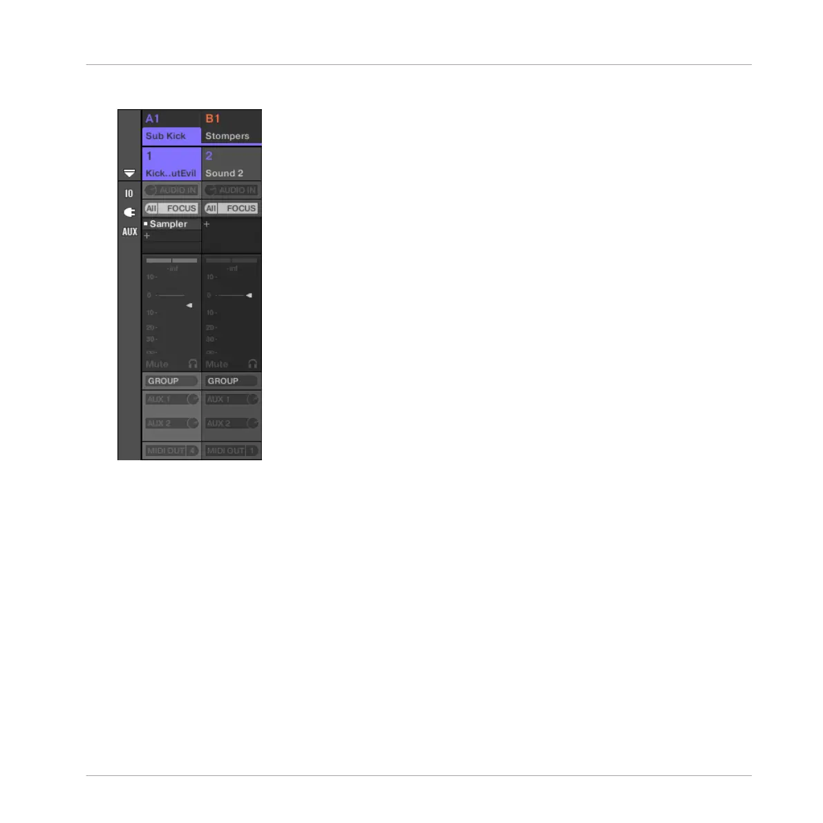 The Mixer displays the channel strips of all Sounds in the selected Group.