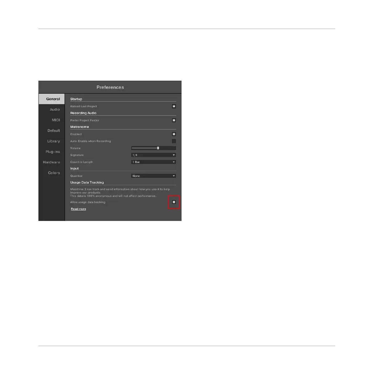 1. Open the General page of the Preferences by clicking Preferences… in the Maschine