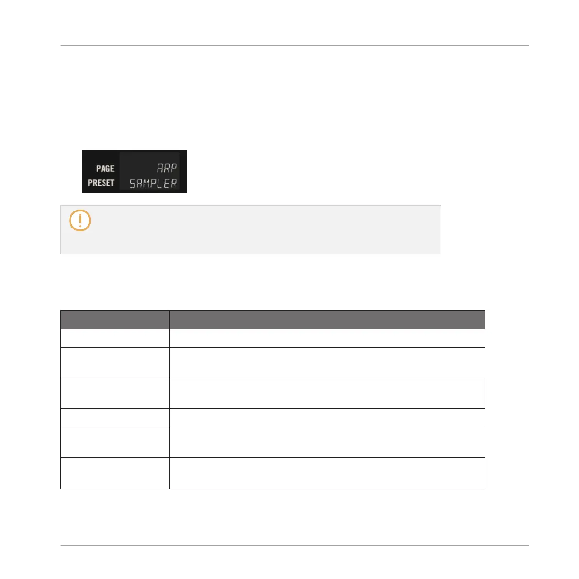 the PAGE field in the leftmost display reads ARP. Note that the PRESET field underneath