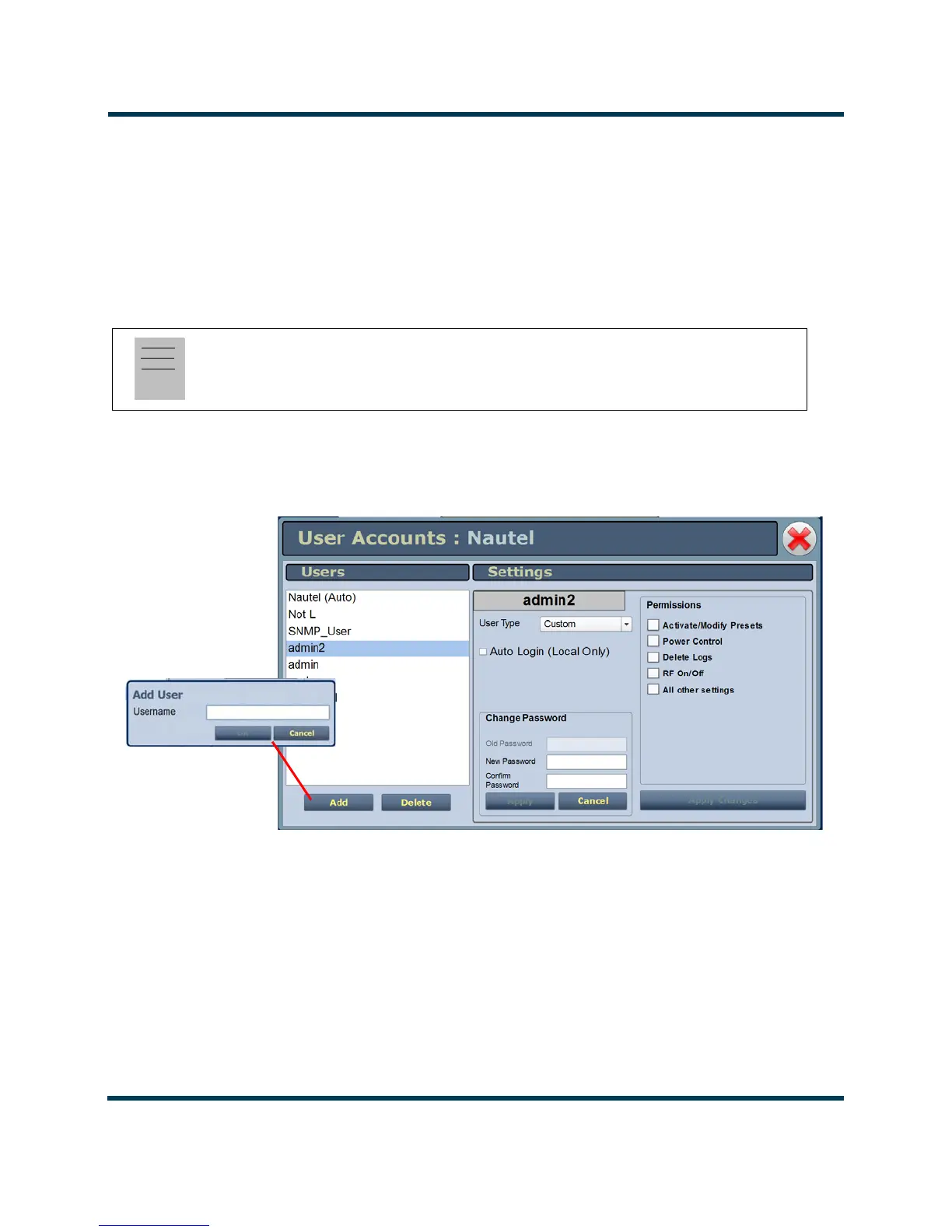 To remove a user account, select the desired user from the Users list and press the Delete button. A
