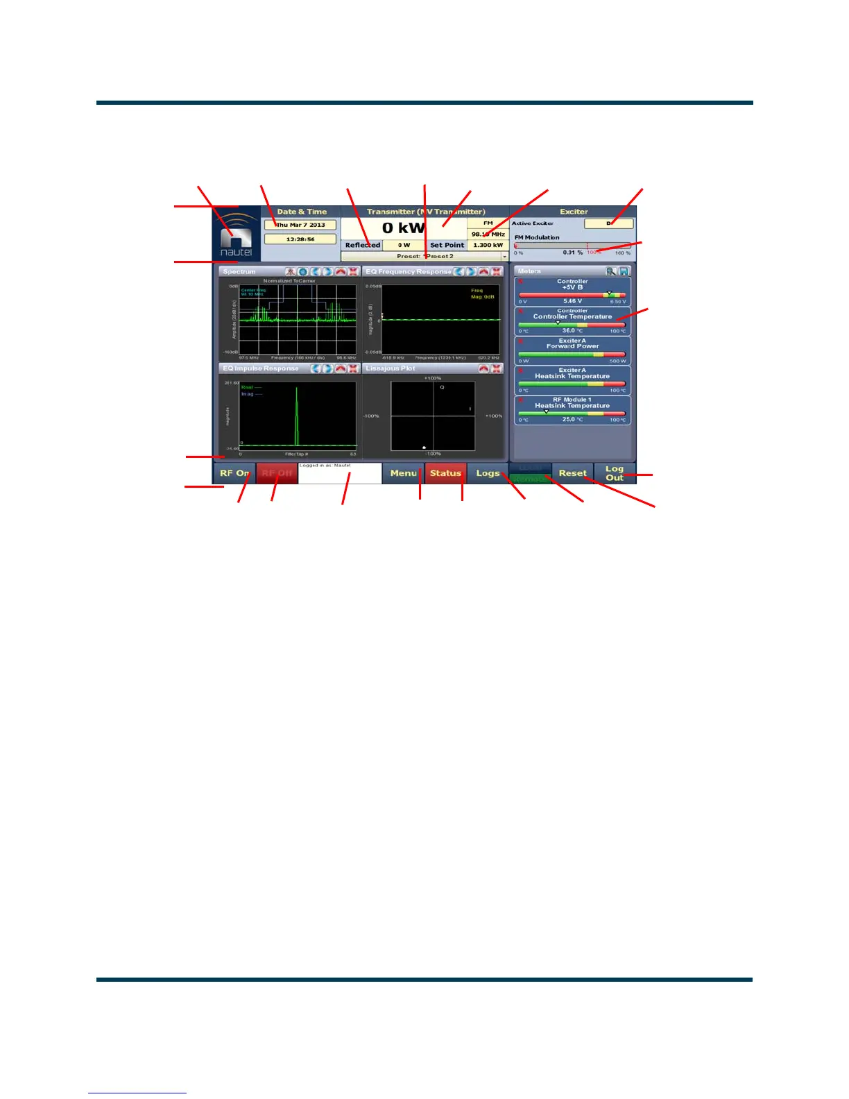 • Nautel Logo: From any AUI page, press the displayed logo to reload the AUI and prompt