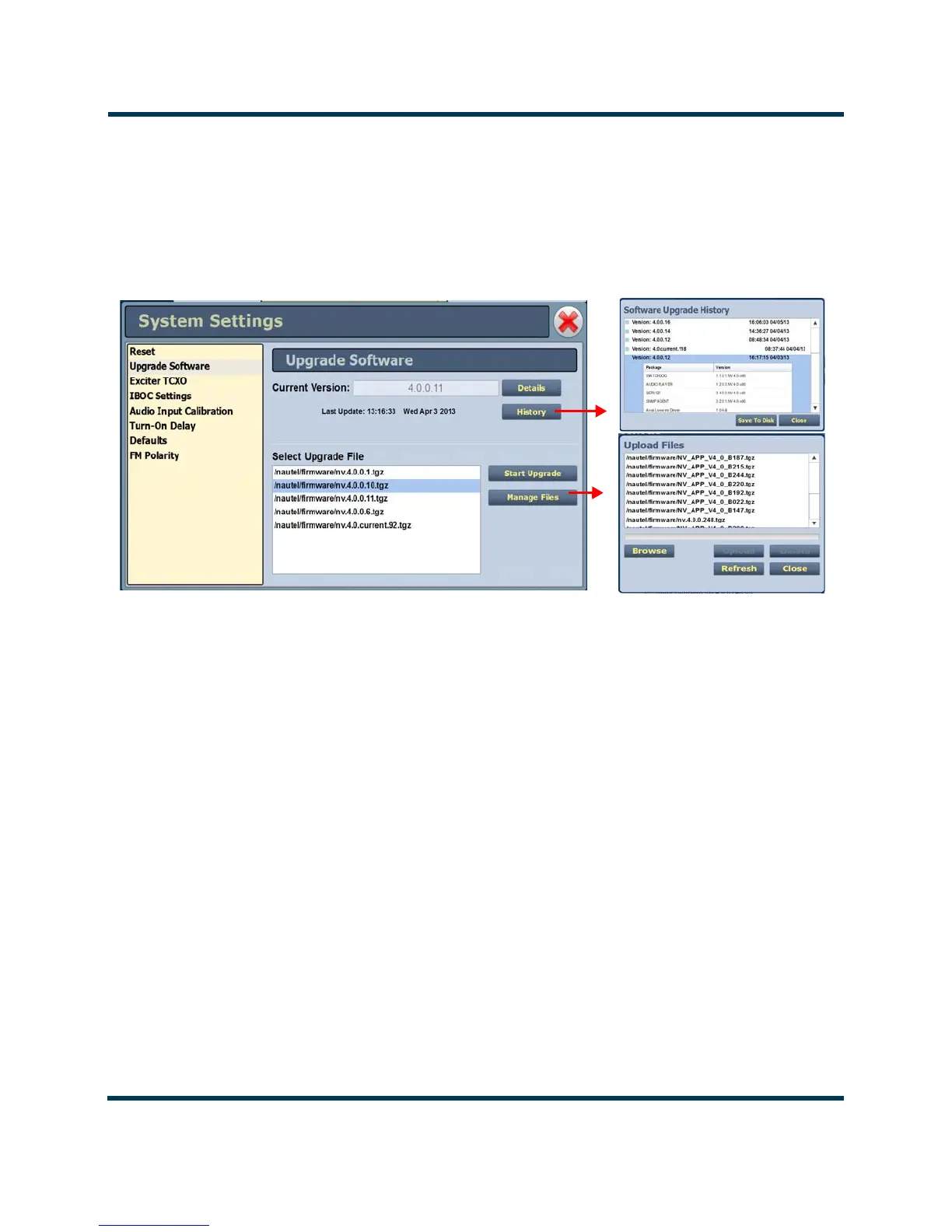 • Select Upgrade File - displays the available upgrade files uploaded to the transmitter.